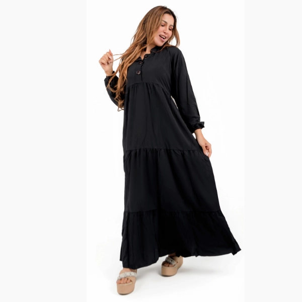 o التصميم: فستان ادوار ساده (طبقات خفيفة) بأكمام كاملة وقطعيه محتشمة