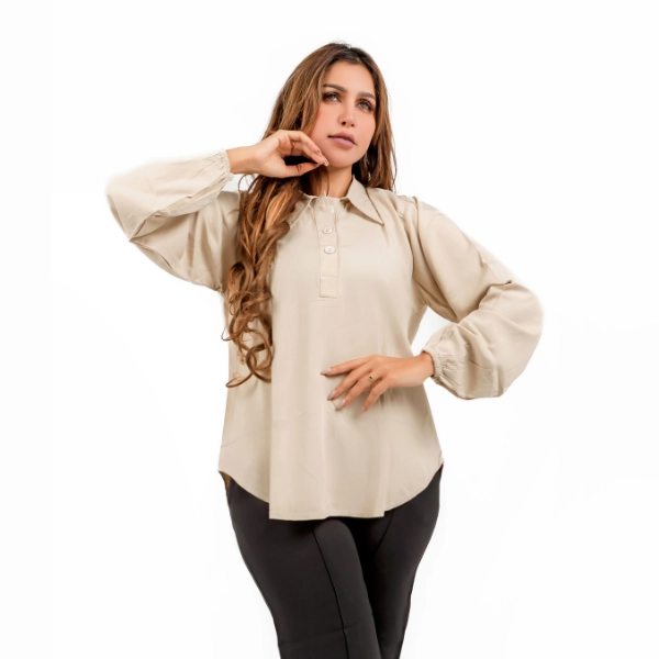 🔹 التصميم: بلوزة بأزرار أمامية وأكمام طويلة