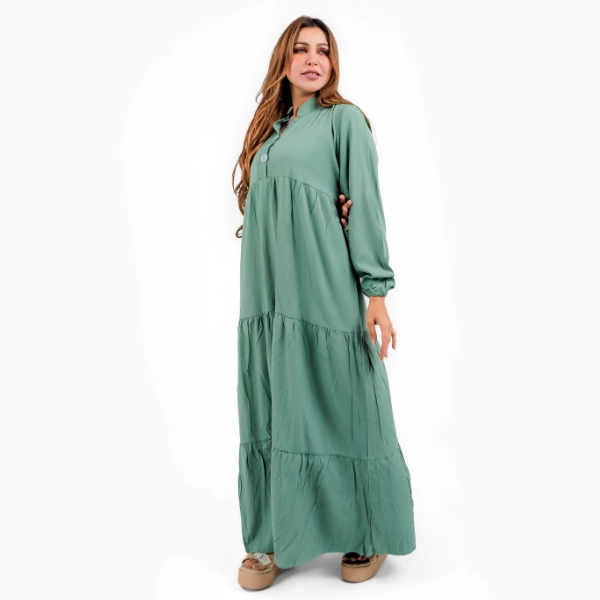 o التصميم: فستان ادوار ساده (طبقات خفيفة) بأكمام كاملة وقطعيه محتشمة