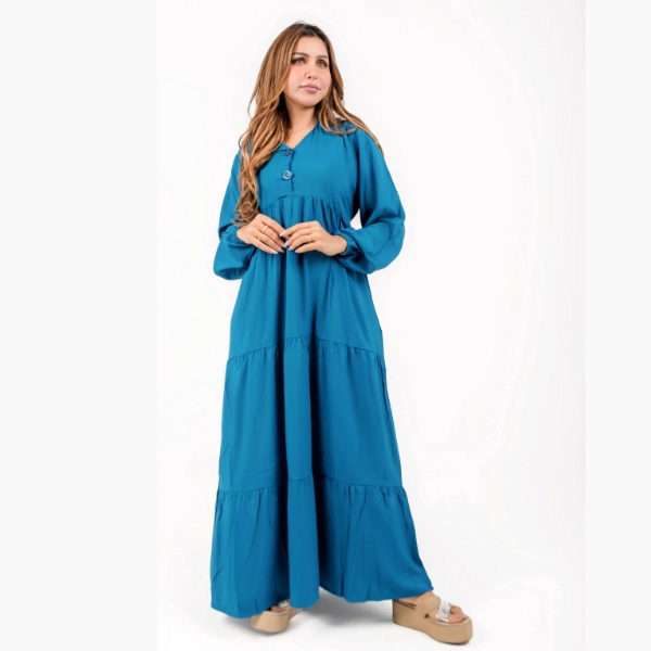 o      التصميم: فستان ادوار ساده (طبقات خفيفة) بأكمام كاملة وقطعيه محتشمة